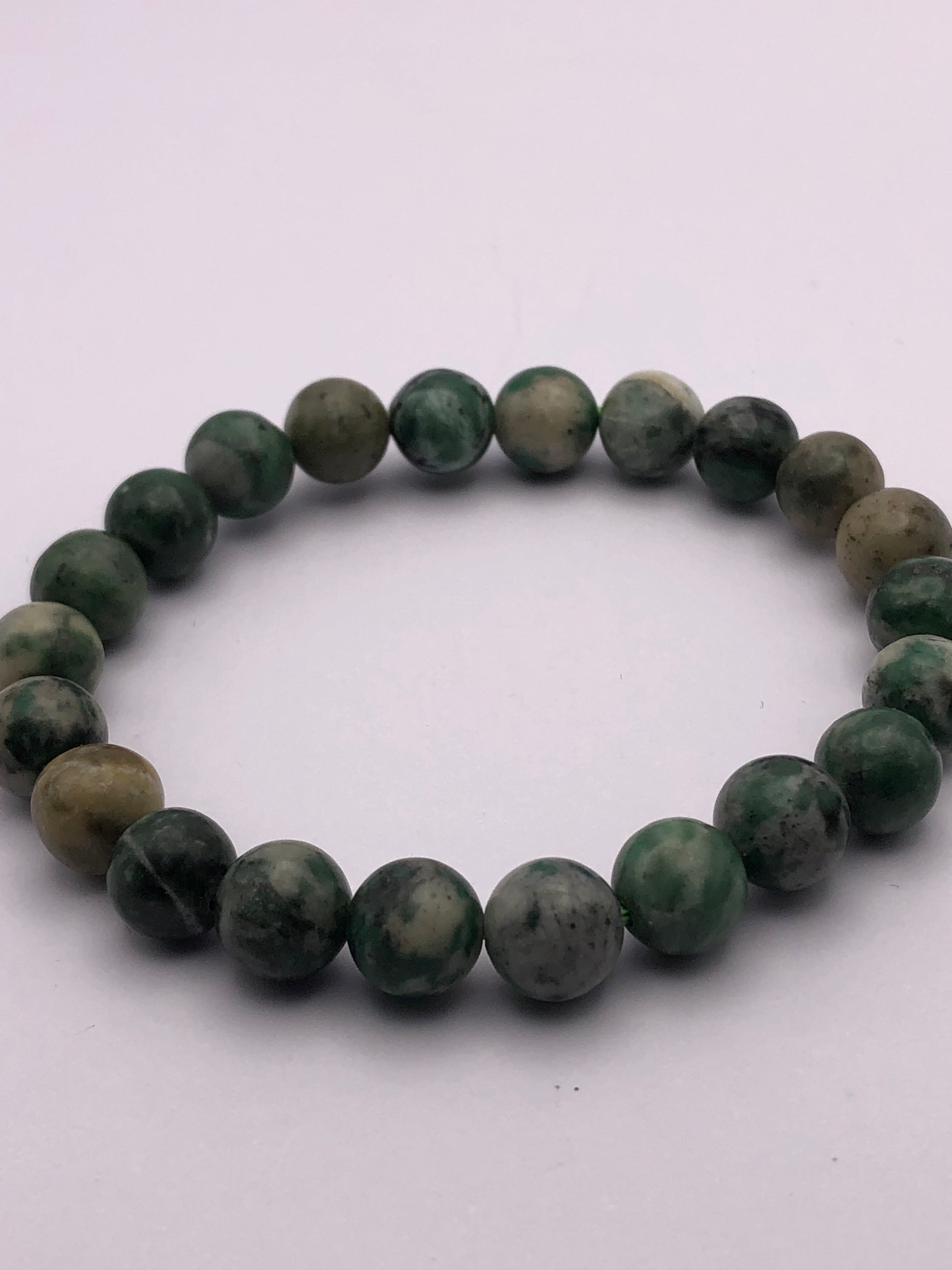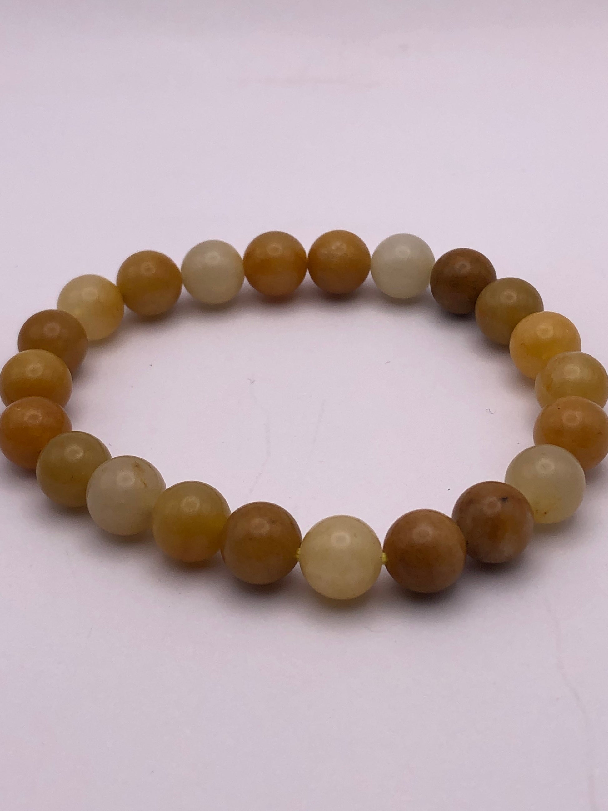 Bead shape is round varying in size between 8 and 8.5 mm. Occasional crack marks on surface or inside bead is common adding to its natural beauty. Handmade with stretchable elastic that may loosen over time with more consistent wearing.