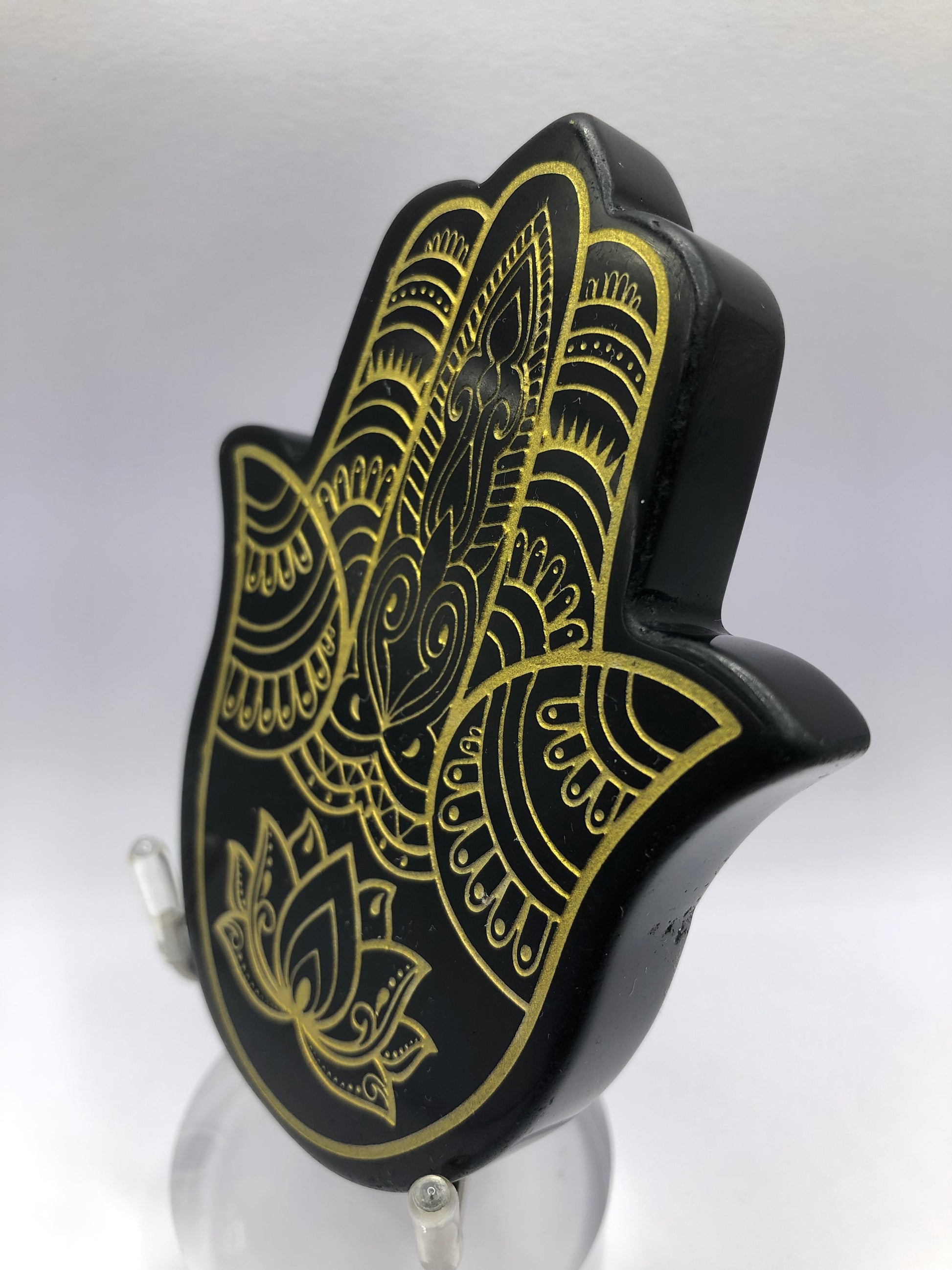 You will receive 1 (one) Black Obsidian Hamsa Hand with gold engravings.